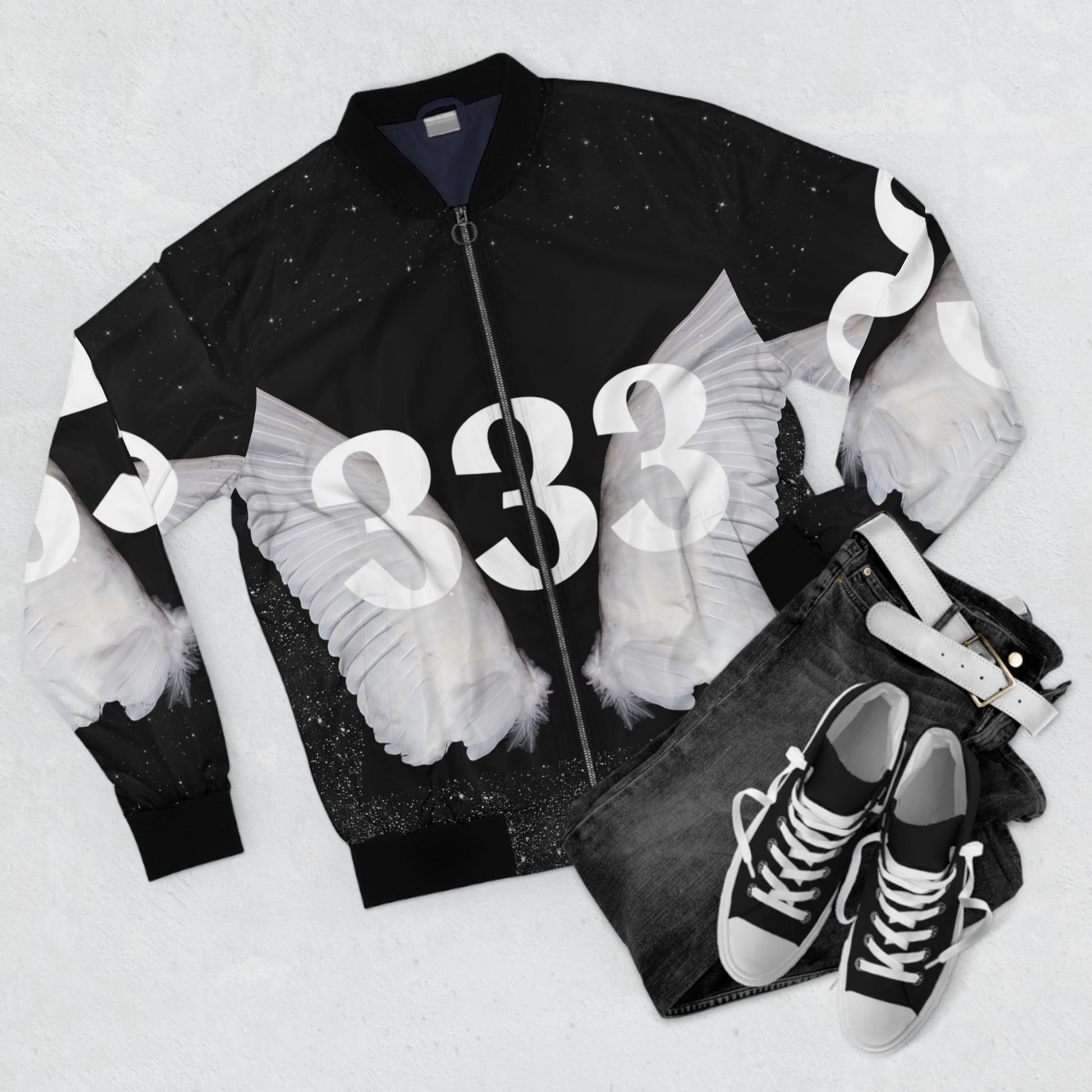 A midnight-black bomber that reads like a personal emblem. White wings spread across the chest, framing a bold '333' that feels part-sigil, part-ward. The lightweight polyester shell holds its shape and sheds drizzle while the dark blue lining adds a subdued contrast when unzipped. Rib-knit collar, cuffs and hem keep warmth close without bulk. Subtle welt pockets and a full metal zipper make it effortless to wear day or night. Wear it when you want an understated statement; a piece that moves with you through city nights, studio sessions, or quiet moments of reflection.